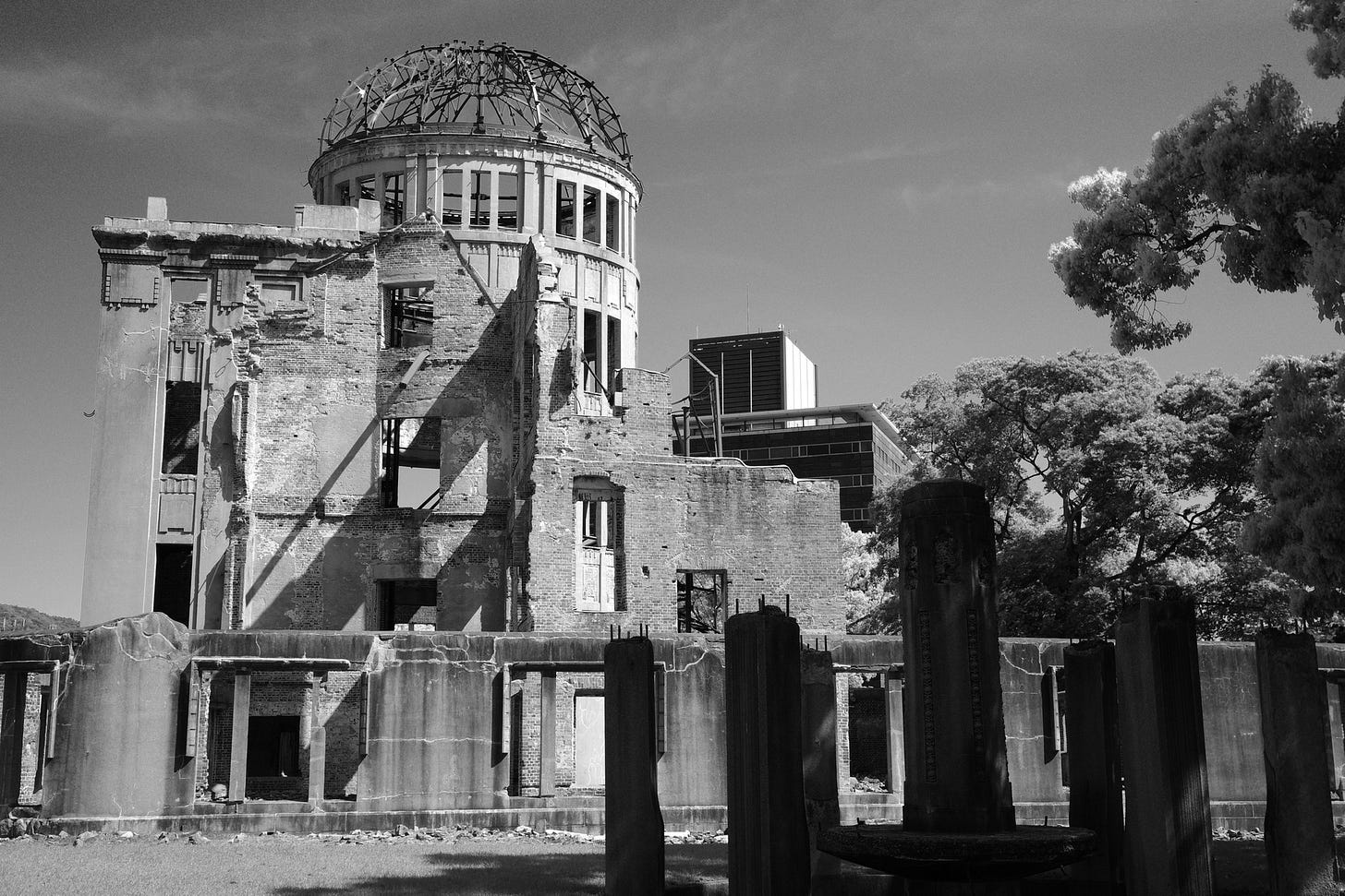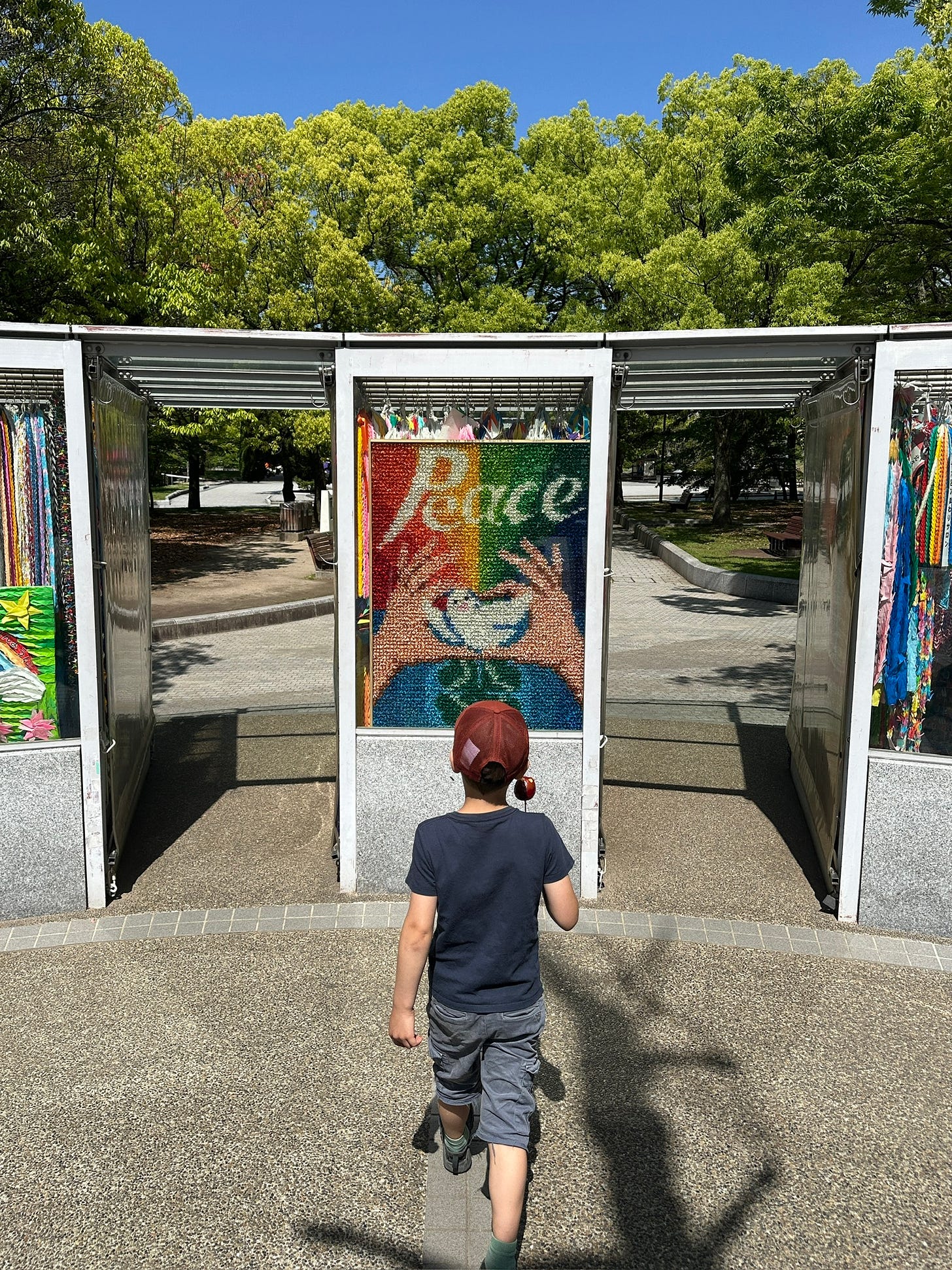 Dat lukt over het algemeen best, want veel van waar ik me thuis zorgen om maak is hier in Japan ver weg, zowel hemelsbreed als in gedachten. En dat is goed, want de boog kan niet altijd gespannen staan. Maar via de telefoon, die gateway naar stress, komt het toch binnen. Vanochtend bij de Genbaku-koepel, die ondanks de locatie vlakbij het hypocentrum van de atoombom 80 jaar geleden overeind bleef staan, kwam het ook binnen, maar directer. In het Hiroshima Peace Memorial Museum, omringd door foto’s van verbrande kinderen en hun artefacten (een driewieler, kleding, een broodtrommel met verkoolde inhoud) ook, maar rauwer.