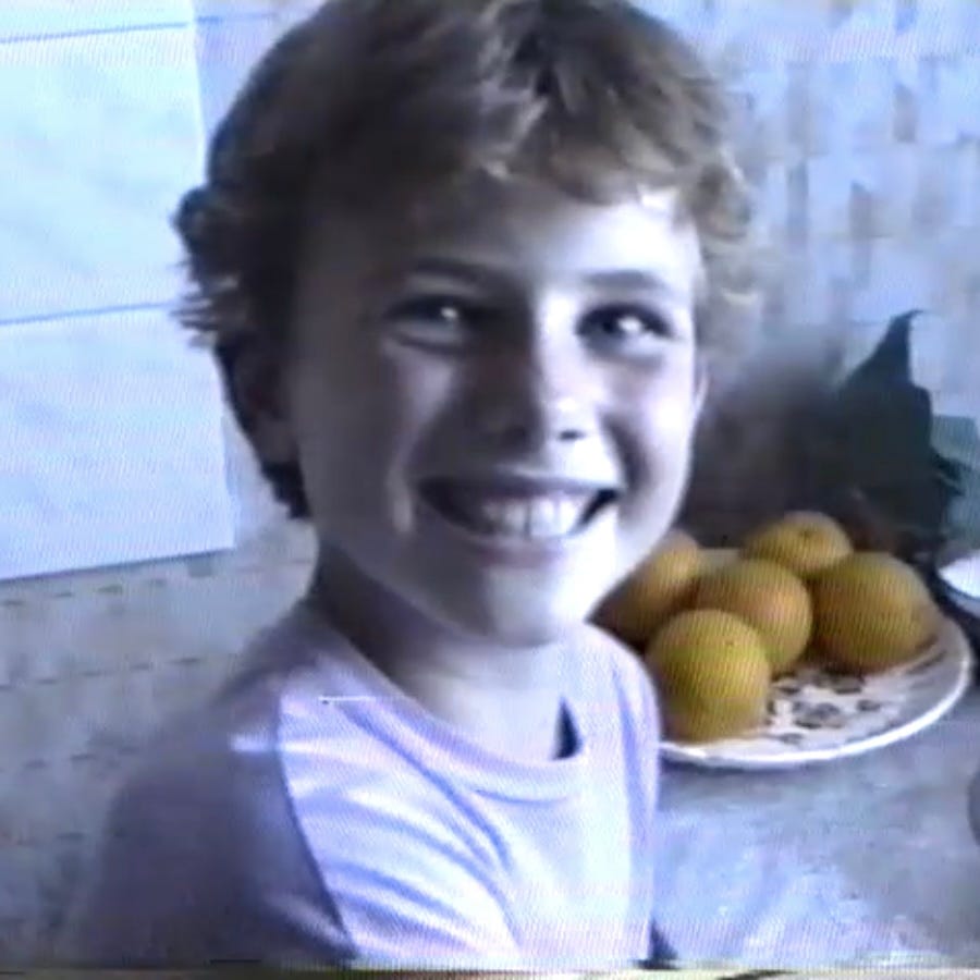 PS. Ik hoop dat ik mijn ongemak omtrent het aankaarten van geldelijke verdiensten voor mijn schrijfwerk een beetje heb kunnen verhullen. Zo niet, is hier ter afleiding een plaatje van mij als 9-jarig jongetje in Polen (geen AI), geflankeerd door een bord sinaasappels. Of zijn het appels? Het zegt wat over de tijd waarin we leven als je uit een VHS-still niet meer kunt bepalen wat voor fruit er in 1992 op een Pools bord lag.